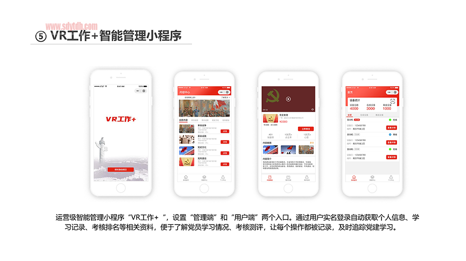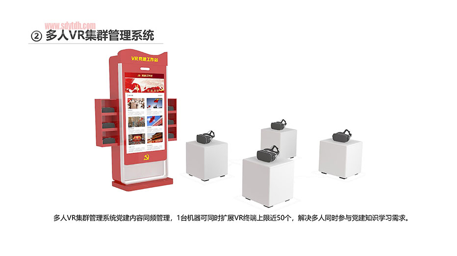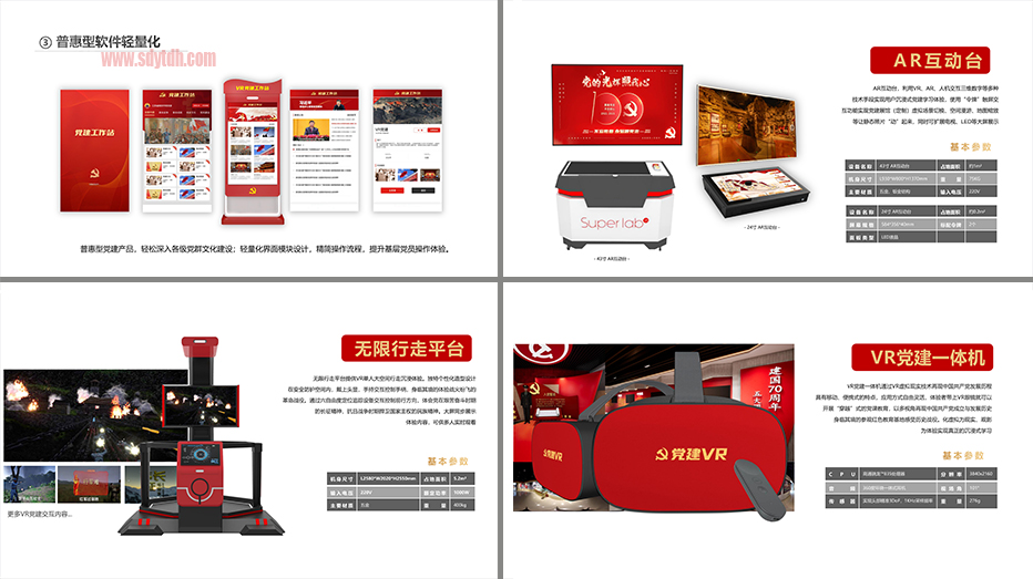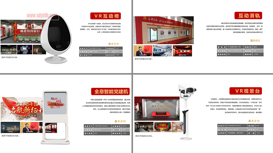 4.VR党建一体机:VR党建一体机通过VR虚拟现实技术再现中国共产党发展历程 具有移动、便携式的特点,应用方式自由灵活,体验者带上VR眼镜就可以 开展“穿越”式