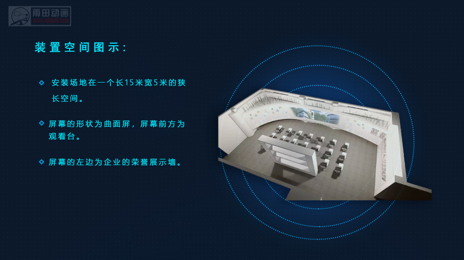 息模块。既要有个体智能信息处理调取、又要兼顾群体参观体验,空间体验在一个长15米宽5米的狭长空间,讨论后我们考虑采用大型弧面屏,即感即现全景式呈现。再配以多