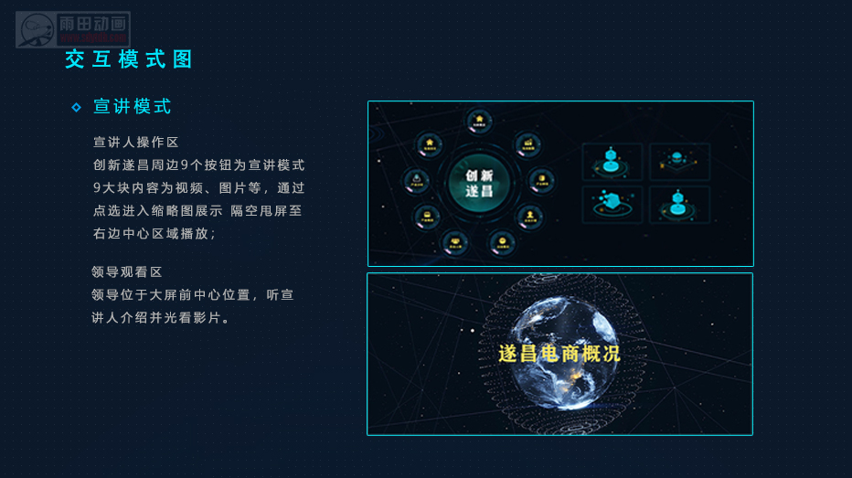 3.逻辑清晰,功能明确。系统功能全面,分为宣讲模式和互动模式两种,宣讲模式以视频方式概括了当地产业、企业的发展,互动模式则更加详细展示了当地企业、产业、人物