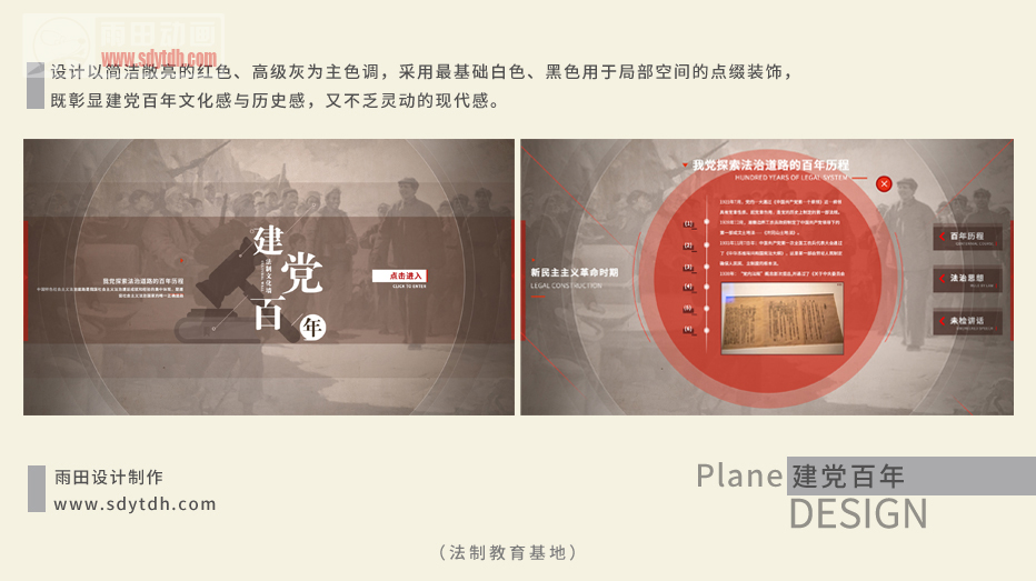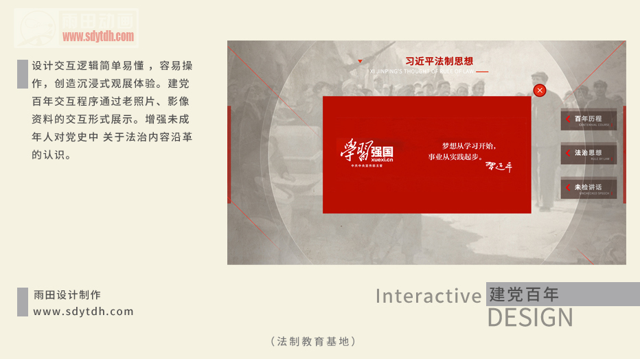 1.建党百年交互程序通过老照片/影像 资料的交互形式展示,增强未成年人对党史中 关于法治内容沿革的认识,以建党后时间发展脉络为轴线,从革命根据地法制建设到全面依法治国,关于建党后法治建设的内容。