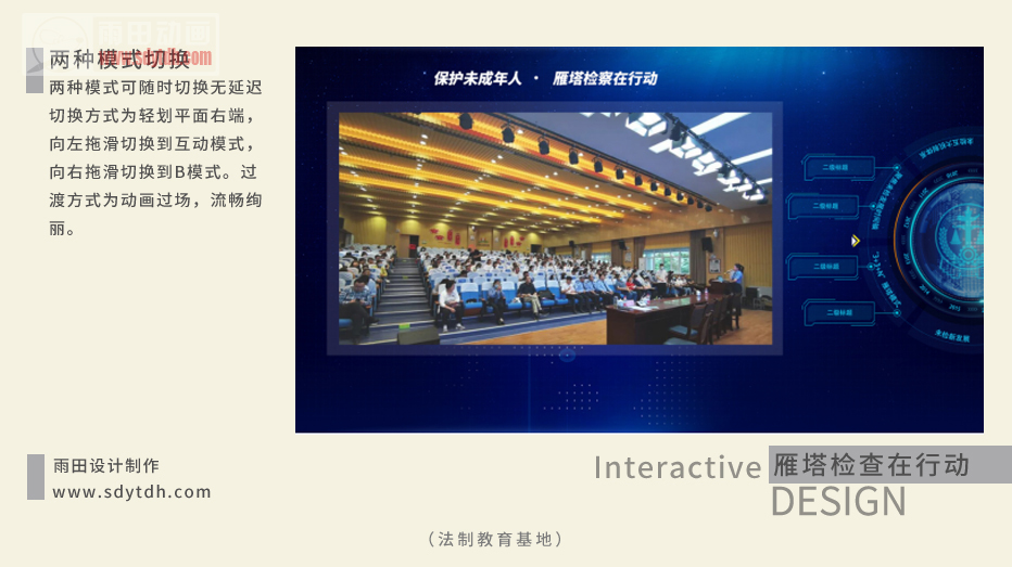 5.雁塔检查在行动交互程序采用了人机交互技术,程序分为两种模式一种为视频模式另一种为交互模式,通过宣传视频、图文交互的方式来展现:聚焦未检发展时间轴线,聚焦“3+3+N未成年人社会矫治“雁塔模 式”、构建未成年检察五大机制体系和未 成年检察新发展等内容,以图文科普、短 视频等方式,综合呈现近三年来的工作理念、工作中心的转变和主要工作内容。其两种模式的功能特点——交互模式:适用与特定对象展示特定内容,从客户角度出发解决时间有限不能从头看到尾,需要调播重点也适用于中间切换。视频模式:适用于无需操作滚播视频等,适用于无人讲解时多人参观。