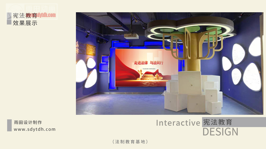 6.宪法教育交互程序由八段二维mg动画以及若干张标题版组成,采用了人机交互技术、体感技术与多媒体相结合的设计思路,以树的造型设计,以果实的形式呈现 宪法及其他法律分支,结合光环的设计形式,体现宪法作为母法的法律至上、权威 地位;在此基础上系统呈现宪法、社会主 义法治体系及相关机构等法律知识。通过 用手触控方块灯箱,联动投影互动呈现生 活常用法律动画解说,以培养青少年的宪 法意识、体系架构以及作为个体与社会、 国家的法治关系,从而深化宪法教育、法 理科普教育。