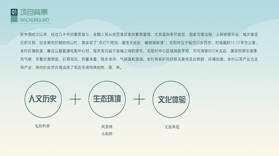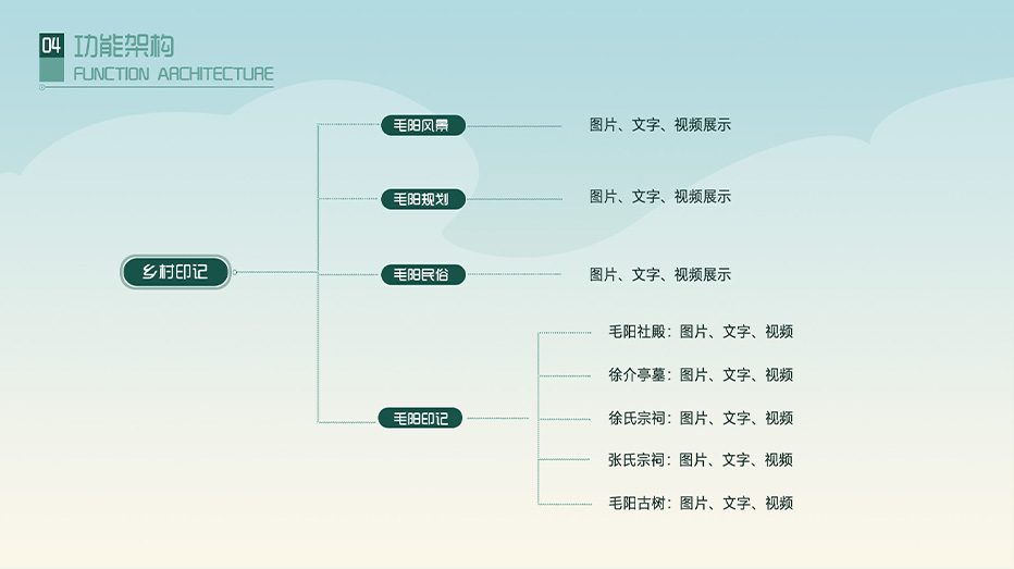 此程序的展示内容由毛阳印记、毛阳风景、毛阳规划、毛阳民宿四部分组成,行业元素,或贴合个性需求通过照片、影像、等资料。展现了毛阳的从贫困落后走向繁荣富强,破房换新楼的风土人情,多角度展示景区的自然景观、文化体验、生态环境、人文历史、传统节庆等方方面面,让游客了解毛阳的文化内涵和活力,增加游客对毛阳的兴趣和参观欲望。