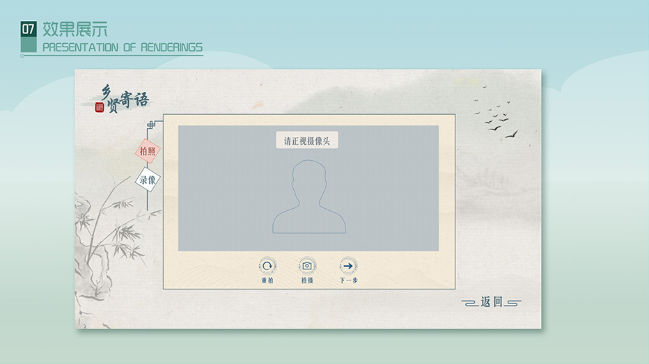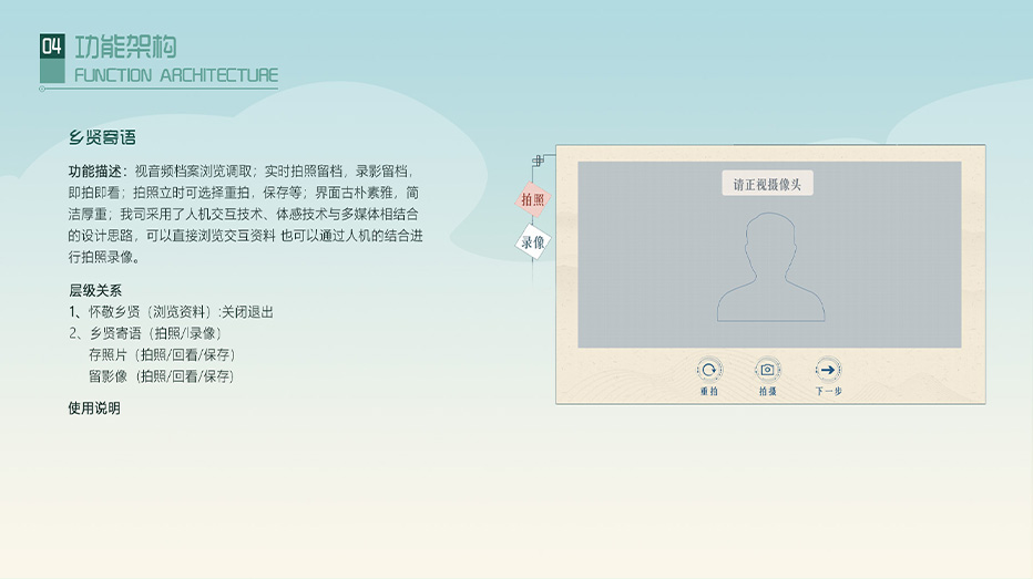 功能描述:视音频档案浏览调取;实时拍照留档,录影留档,即拍即看;拍照立时可选择重拍,保存等;界面古朴素雅,简洁厚重;我司采用了人机交互技术、体感技术与多媒体相结合的设计思路,可以直接浏览交互资料 也可以通过人机的结合进行拍照录像。