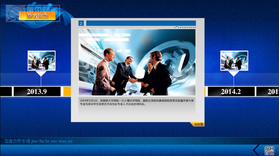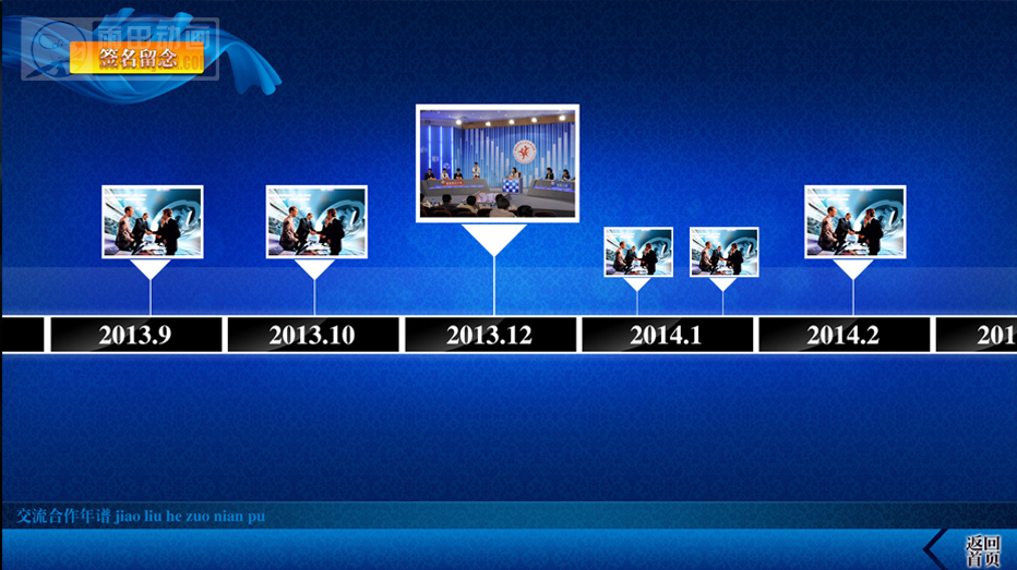 项目名称:成都 医科大多点触控合作交流年谱查询 项目内容:办公楼及展馆红外触控屏,红外翻书,电子签名,远程编辑发布等多功能模块。 创意阐述:时间轴,清晰明了,操作便捷。