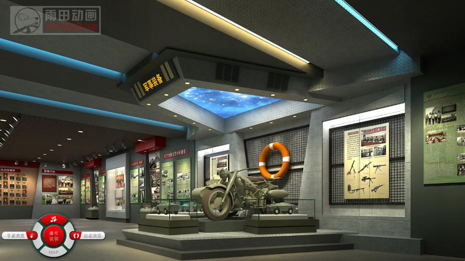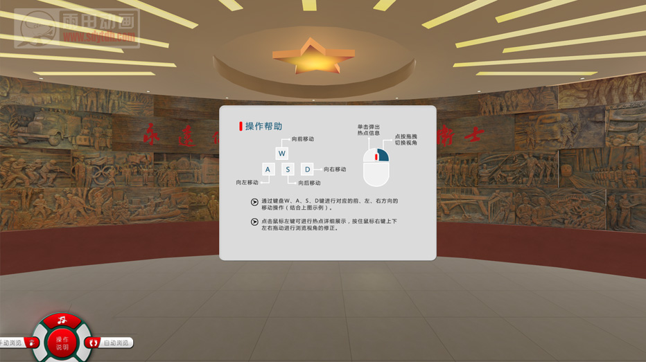 1.服务导向:本例为数字展厅漫游,智能交互类程序。内容包括虚拟漫游参观,弧形屏幕,对应图像资料查询(图文视频资料),馆内动态展示继动态更新等模块。