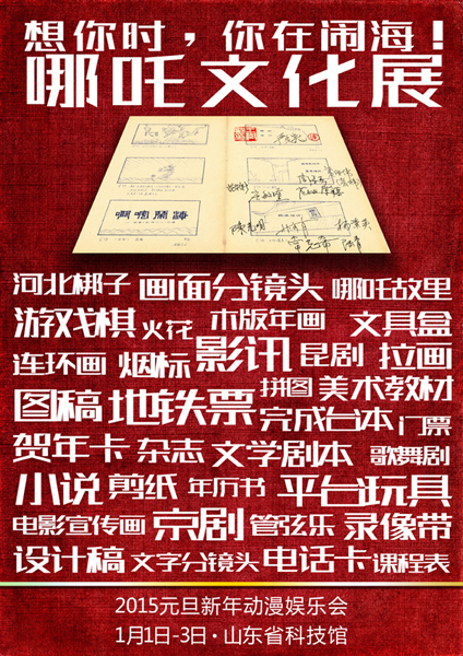 2015年1月1日至3日,2015元旦新年动漫娱乐会将在山东省科技馆举行。主办方世博动漫携手空藏动漫资料馆共同向动画爱好者推出“中国梦动漫梦——动漫文化系列展”之“想你时,你在闹海——哪吒文化展”。哪吒文化展对哪吒文化进行了系统的梳理,展出年画、小说、烟画、插画、门票、戏剧、火花、连环画、明信号、曲谱、剧本、烟标、画片、电话卡、图书、课本、海报、动画片画面分镜头、文具盒、录像带、课程表等近百件与哪吒相关的民俗艺术、实用品和各类资料。